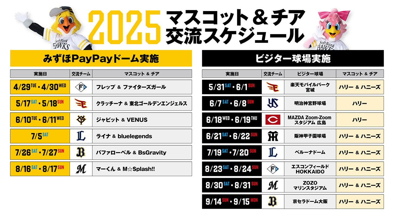 2025シーズンはみずほPayPayドーム福岡でマスコット・チア交流を開催!ビジター球団のマスコット・チアがみずほPayPayドームに登場し、ホークスパフォーマンスチームとの共演など、その日限りのスペシャルコラボパフォーマンスを披露して球場を盛り上げます!