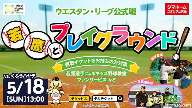 タマホーム スタジアム筑後で開催するウエスタン・リーグ公式戦では、5月もイベントが盛りだくさん♪ゴールデンウィーク前半は「ウェルカム☆ビジターデー」、後半は全席「GO!GO!マラカス」付きの“GWキッズデー”を実施します☆また、昨年も好評だった「ビールワンコインデー」や、初開催となる「若鷹とプレイグラウンド」にもご注目ください!さらに、5月からはナイトゲームがスタート!金曜日は「“フライ”デーナイト」で熱く盛りアガろう☆