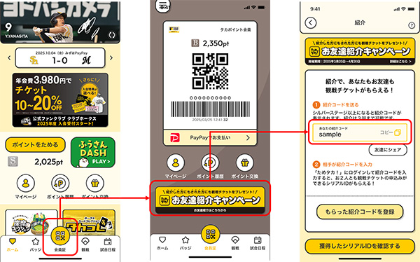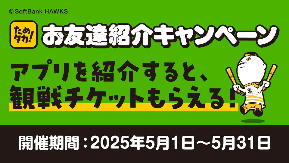 まだ「ためタカ!」アプリを利用したことがないお友達にアプリを紹介すると、紹介した方にもされた方にも観戦チケットをプレゼントします!