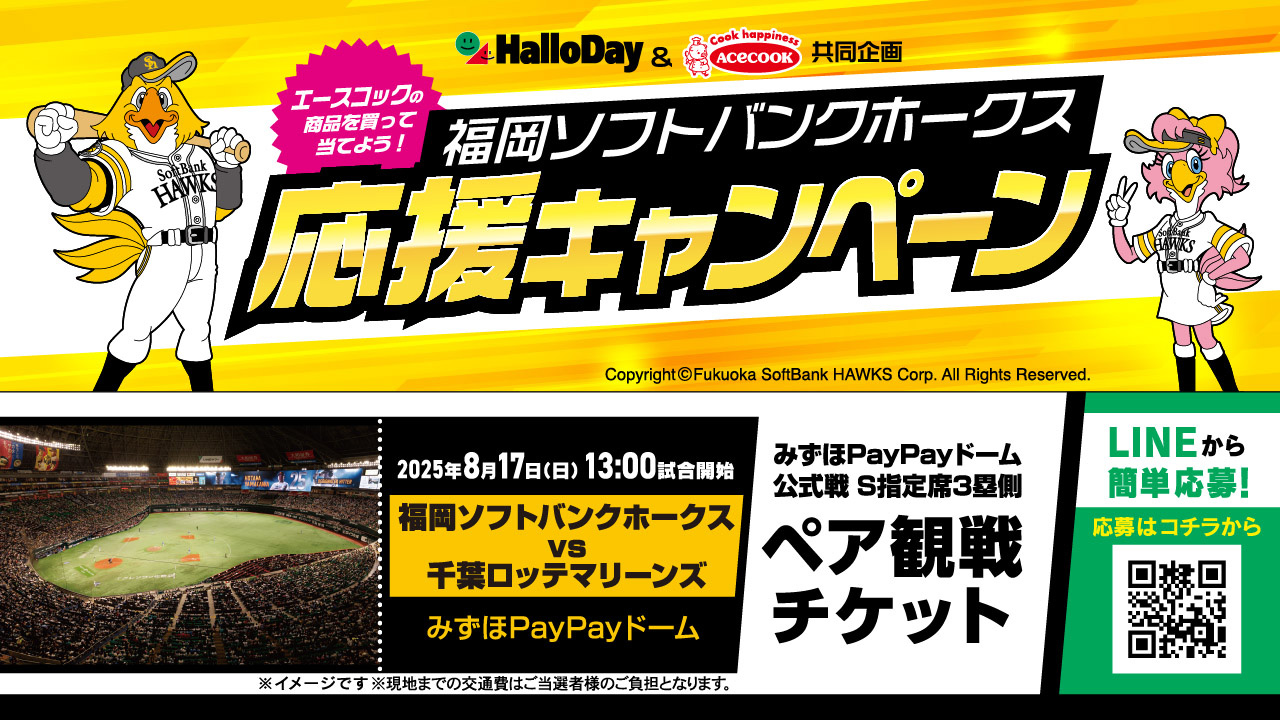 ハローデイとエースコックが、共同企画「福岡ソフトバンクホークス応援キャンペーン」を実施。エースコックの商品を買うと、みずほPayPayドームで開催されるホークス戦の観戦チケットが当たります!ぜひこの機会にエースコックの商品を買って応募しよう!