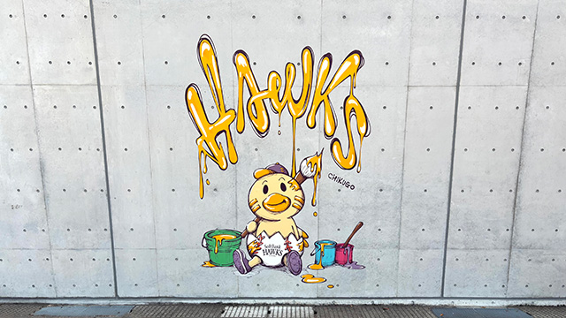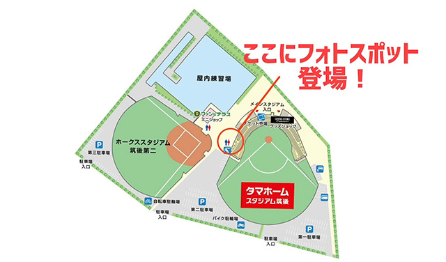 タマスタ筑後の壁面に、「ひな丸Tシャツ2025」デザインのフォトスポットが登場♪フォトスポットのイラストは、今シーズン終了まで掲示予定です。ぜひ、「ひな丸Tシャツ2025」を着て、思い出の一枚を撮影してください!