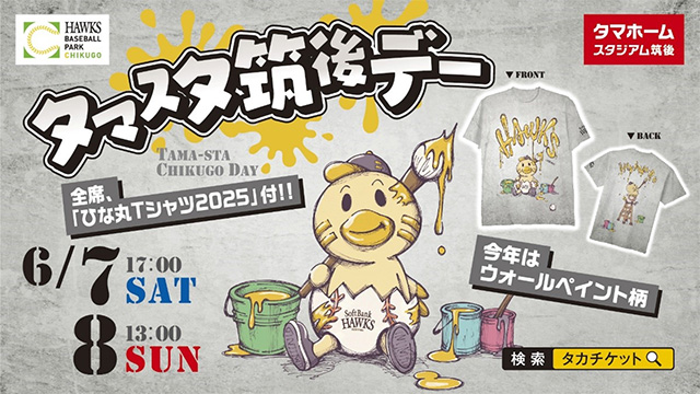 6月7日(土)・8日(日)開催の「タマスタ筑後デー」では、配布する「ひな丸Tシャツ2025」を、なんと選手から直接手渡しで受け取れるイベント参加券を、500円で販売します♪チケットは5月11日(日)から販売開始。枚数限定のため、ご購入はお早めに!