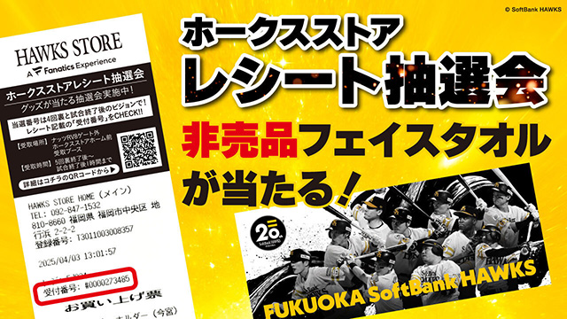 対象店舗にて、グッズをご購入の方から抽選で非売品のタオルが当たるレシート抽選会を開催!開催日の4回裏終了後に、みずほPayPayドーム内の大型ビジョンで当選番号を発表します♪グッズ購入レシートは、捨てないようご注意ください!