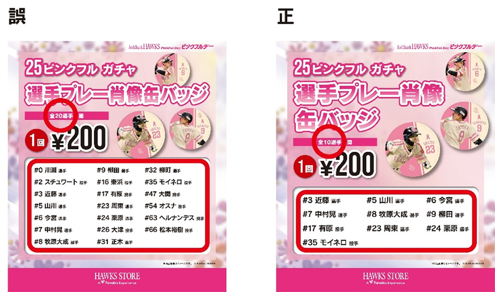 このたび、HAWKS STORE HOME前カプセルショップおよびHAWKS STORE FAMILYにて販売の商品「25ピンクフル ガチャ 選手プレー肖像缶バッジ」のPOPに関しまして、誤表記が判明いたしました。