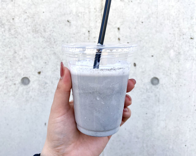 タマスタ筑後の“壁”色そっくりなシェイクが登場♪黒ごま×牛乳でコクのある、シンプルに美味しいシェイクです。