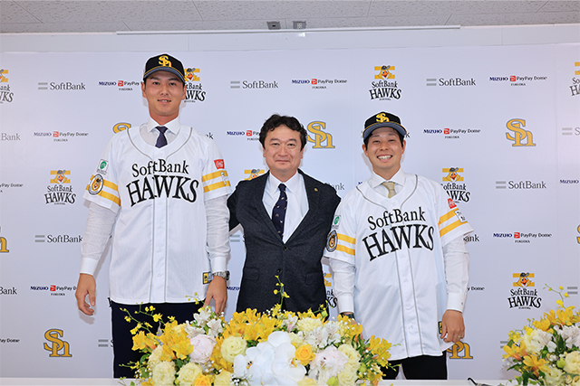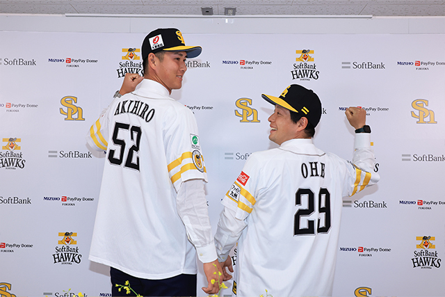 ホークスの印象について大江投手は「1番から9番まで本塁打が打てて、ランナーに出ると足が速い強いチーム」、秋広選手は「自分が小さいころから強いチームで、一人一人がすごい選手ばかり」と語り、秋広選手は「簡単ではないが、なんとか試合に出て活躍したい」と意気込みを語りました。
