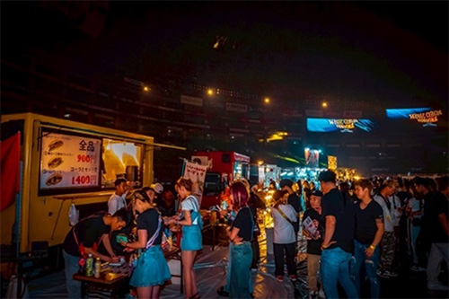 MUSIC CIRCUS FUKUOKAでは、地元・福岡をはじめ、全国各地のフェスで話題のグルメが集結!バラエティ豊かなグルメを提供します。会場内のベンチスペースでは、音楽を楽しみながらゆったりとフェス飯を味わえます。