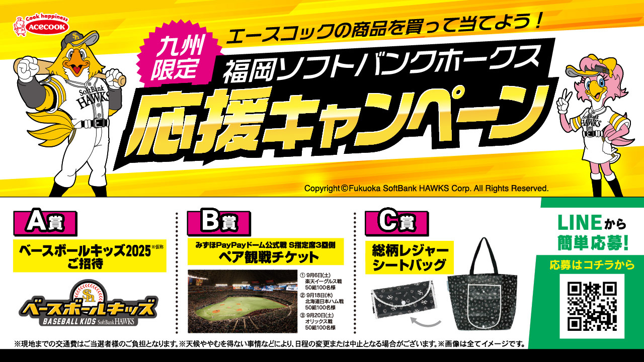 エースコックは、九州エリア限定企画として「福岡ソフトバンクホークス応援キャンペーン」を実施します。エースコックの商品を買うと、ベースボールキッズの参加権や、みずほPayPayドームで開催されるホークス戦の観戦チケットが当たります!ぜひこの機会にエースコックの商品を買って応募しよう!
