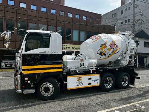 ホークスラッピングのミキサー車が福岡市内を走ります。今後撮影した写真のSNS投稿キャンペーンなども予定しておりますので、詳しくはミキサーセンター公式サイトをご確認ください。