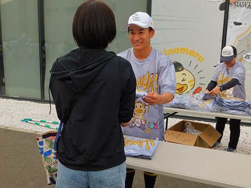 9月13日(土)・14日(日)開催の「タマスタ筑後デー」では、配布する「ひな丸Tシャツ2025」を、選手から手渡しで受け取れるイベント参加券を、500円(税込)で販売します♪チケットは7月20日(日)10:00より販売開始します。枚数限定のため、ご購入はお早めに!