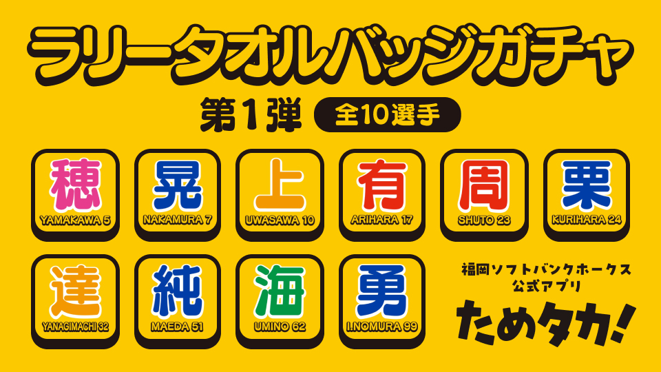 ホークス公式アプリ「ためタカ!」のガチャに、人気応援アイテム「ラリータオル」と同じデザインのバッジが登場!さらに、ガチャに10回参加いただいた方を対象に、観戦チケットが当たるキャンペーンも実施します。