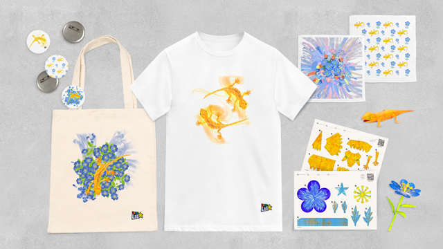 《鼓動する谷のグラフィティネイチャー - Symbiotic Lives, A Whole Year per Year, Red List》で自分が描いて生まれた生き物が、その場でオリジナルの缶バッジ、ハンドタオル、Tシャツ、トートバッグ、ペーパークラフトになり、思い出を持ち帰ることができます。