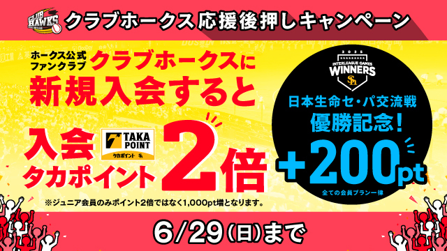 6月29日(日)までの新規ご入会で、入会ポイントが2倍となる「クラブホークス応援後押しキャンペーン」が交流戦優勝を記念して、さらに+200pt!