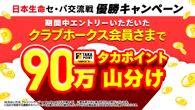 9度目の交流戦優勝を記念して、タカポイント90万山分けキャンペーンを開催!キャンペーン期間中にエントリーいただいた方のみポイント付与となりますので、エントリーをお忘れなく!