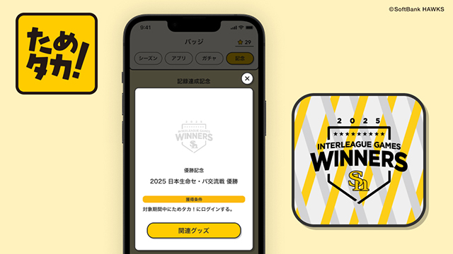 対象期間中、「ためタカ!」アプリにログインするともれなく交流戦優勝記念バッジがもらえます。