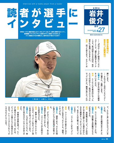 また、月刊ホークス定期購読プレミアムプランにご加入の読者がインタビュアーとして選手に質問する「読者が選手にインタビュー」。今回は明るいキャラクターでチームの盛り上げ役でもある岩井俊介投手が登場。マウンドで見てほしいのは、髪がなびくところ!?珍回答で大いに盛り上げてくれました!