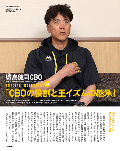先月号に引き続き、城島健司チーフベースボールオフィサー(CBO)のインタビュー後編を掲載。改めて城島CBOの役割と王イズム継承への想いを語っていただきました。