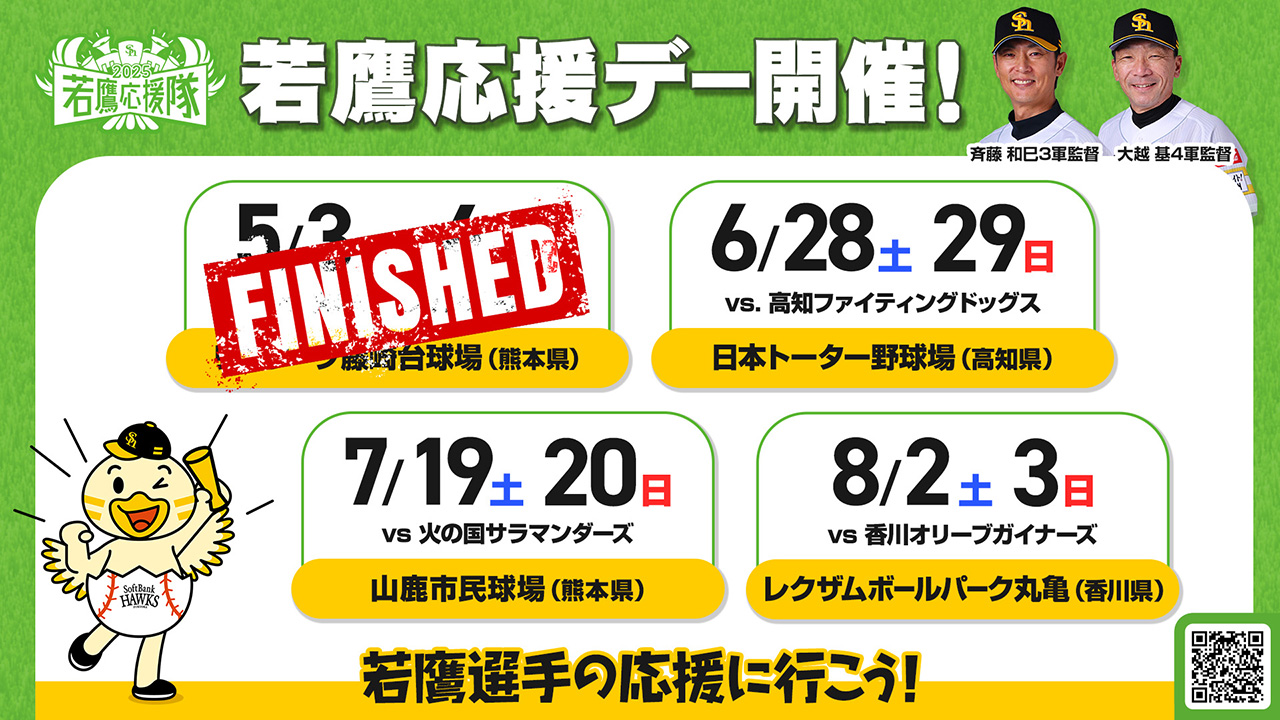 2025年シーズンを通して、ビジター球場で3軍・4軍の若鷹選手を応援する「若鷹応援デー」を開催中!第3弾は熊本県、第4弾は香川県で実施します☆普段はタマホーム スタジアム筑後に足を運べないホークスファンの皆さまに向けて、ビジター球場各地でファンサービスを展開!もちろん、福岡県から応援に駆けつけるのも大歓迎です!「若鷹応援隊」の一員として、ビジターでも熱い声援を届けましょう!