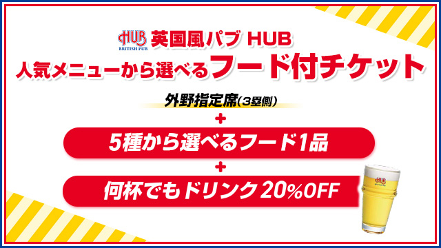ご購入の際は必ず「【英国風パブ HUB】人気メニューから選べるフード付チケット」をお選びください。通常の外野指定席3塁側をご購入いただいても、「英国風パブ HUB」のフードやドリンク20%OFFはご利用いただけません。