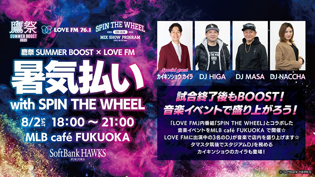 8月2日(土)の試合終了後は、「LOVE FM」内番組「SPIN THE WHEEL」とコラボした音楽イベントを3FMLB café FUKUOKA で開催☆LOVE FMに出演中の3名のDJが店内を盛り上げるだけではなく、同時刻に放送の「SPIN THE WHEEL」との電話中継も!さらにスペシャルゲストにはタマスタ筑後でスタジアムDJを務めるカイキンショウのカイラが登場します! 美味しいグルメや素敵な音楽を楽しみながら試合後まで鷹祭 SUMMER BOOSTを楽しみませんか?
