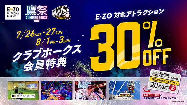 クラブホークス会員限定でE・ZO対象アトラクションが通常価格より30%OFFに!この機会にE・ZOのエンタメを満喫しよう!
