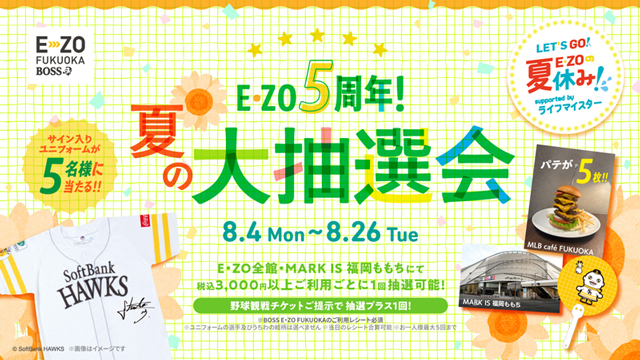 8月4日(月)~26日(火)の期間、「5」にちなんだ豪華景品が当たる“夏の大抽選会”を実施します。E・ZOアトラクションチケットや館内飲食店レシートをご提示で抽選会へご参加いただけます。さらにMARK IS 福岡ももちのレシートも合算可能です。