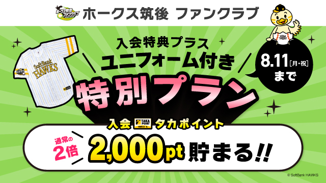 - ※タカポイント会員(無料)にご登録のうえ、会員マイページより「ホークス筑後ファンクラブ」へのご入会手続きをお願いいたします。