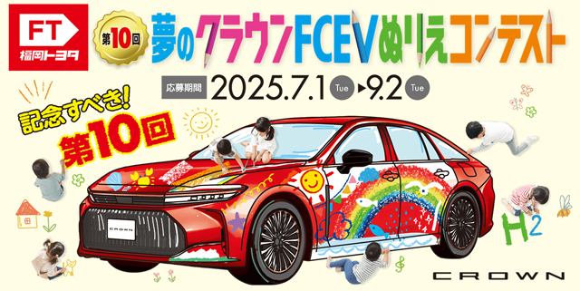 福岡トヨタが7月1日(火)から9月2日(火)までの期間に開催する第10回「夢のクラウンFCEVぬりえコンテスト」に参加して和田 毅さんやホークスマスコットキャラクターとのコラボ自由帳をGETしよう!