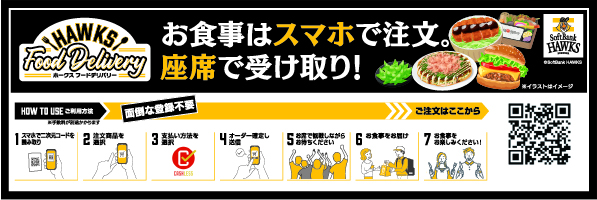 お座席についている二次元コードからスマホで注文しオンライン決済いただくとみずほPayPayドームコンコース店舗・鷹マルシェ・BOSS E・ZO FUKUOKA内The FOODHALL・英国風HUBからお席までデリバリーサービスいたします!(一部座席に限る)
