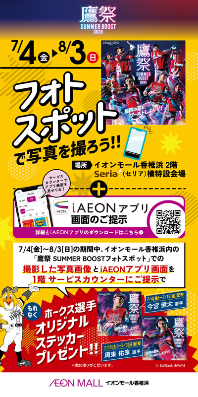 イオン九州株式会社は、昨年好評だった「鷹祭 SUMMER BOOSTフォトスポット」を、7月4日(金)~8月3日(日)の間、イオンモール香椎浜に設置します!また、イオンモール香椎浜 サービスカウンターでiAEONアプリ画面とフォトスポットで撮影した写真を提示した方に、ホークス選手のオリジナルステッカーをプレゼント!さらに、7月26日(土)27日(日)限定で、鷹祭 SUMMER BOOST 2025 ユニフォーム (レプリカ)や鷹祭 SUMMER BOOST 2025クリアファイル、オリジナルマスクなどが当たる「イオンモール香椎浜の鷹祭 SUMMER BOOST 抽選会」を開催!当日1,000円(税込)以上のレシートとiAEONアプリ画面の提示するだけで参加できます!さぁこの夏もイオンモール香椎浜でホークス応援しながら、とびきりアツくなろう!