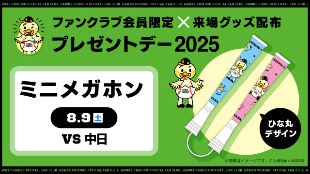 8月9日(土)中日戦にて、ホークス筑後ファンクラブ会員限定のプレゼントデー第5回を開催します!