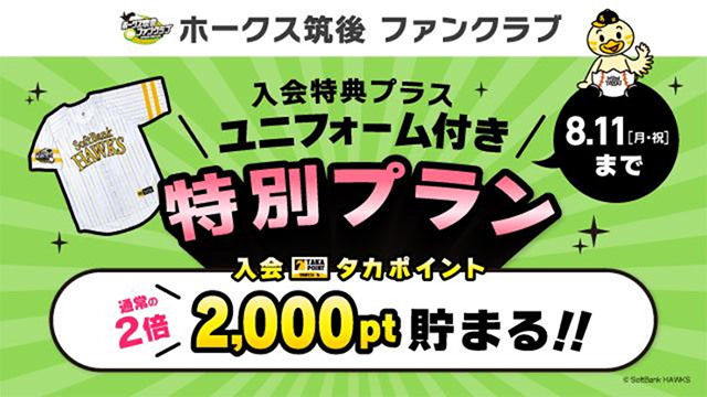 さらに、8月11日(月・祝)までにキャンペーンコードを入力して入会すると、入会タカポイント2,000pt&クラブホークスオリジナルユニフォームをGETできる特別入会プランも実施中♬