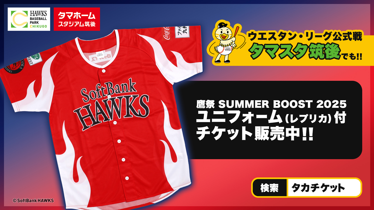 タマスタ筑後では、「鷹祭 SUMMER BOOST 2025ユニフォーム(レプリカ)」をはじめ、ユニフォームやグッズ付きのチケットも販売中です。タマスタ筑後オリジナルの応援グッズ「GO!GO!マラカス」が手に入るチャンスもあります。詳細は下記をご確認ください。
