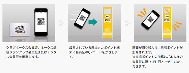 ゲートに設置している来場ポイント端末に、クラブホークス会員証・ホークス筑後ファンクラブ会員証・タカポイントカード・デジタル会員証のいずれかをかざしてください。