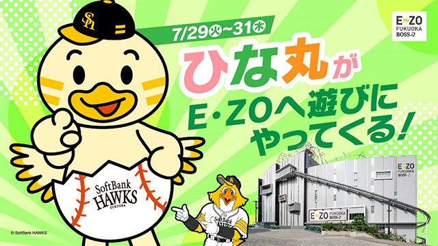 2025年7月29日(火)~31日(木)にみずほPayPayドームで開催される、ウエスタン・リーグ公式戦(くふうハヤテ戦)にあわせて、BOSS E・ZO FUKUOKAでは野球観戦をさらに楽しめるイベントを実施します。筑後からはひな丸がE・ZOにやってきます!ウエスタン・リーグ観戦とともに、E・ZOを満喫しましょう!