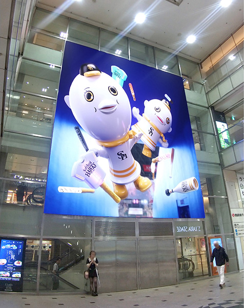 福岡市・天神の商業施設「ソラリアステージ」の広場に設置されている大型ビジョン『SOLARIA DAIGAMEN(ソラリア大画面)』で、ホークス初のオリジナル3D動画広告を放映中!立体的に浮かび上がる映像表現を可能にしたこの3D広告は、特別なメガネなどを必要とせず、通行中の誰もが楽しめます。