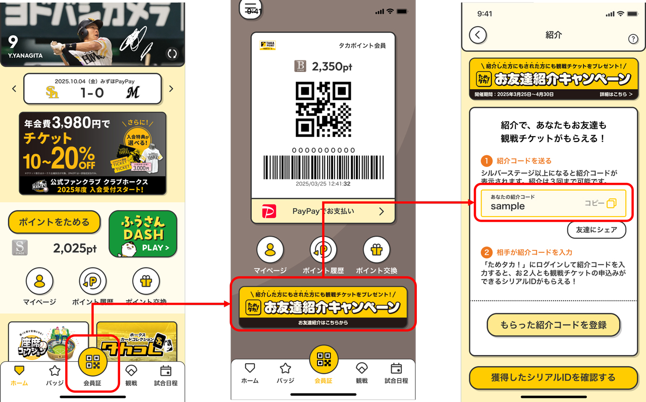 ご好評につき、引き続きホークス公式アプリ「ためタカ!」お友達紹介キャンペーンを開催!まだ「ためタカ!」を利用したことがないお友達に「ためタカ!」を紹介すると、紹介した方にもされた方にも観戦チケットをプレゼントします。