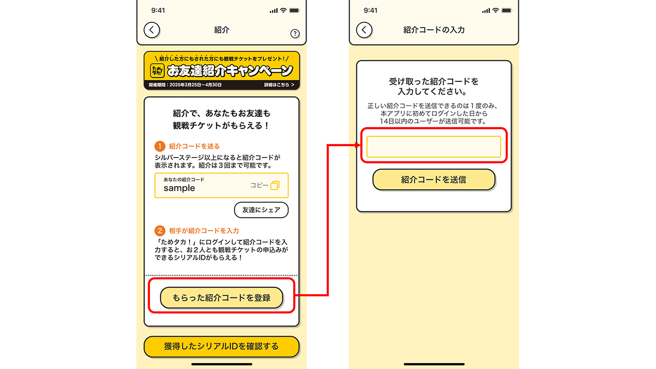 デジタル会員証の「お友達紹介キャンペーン」バナーより、お友達から受け取った「紹介コード」を入力してください。
