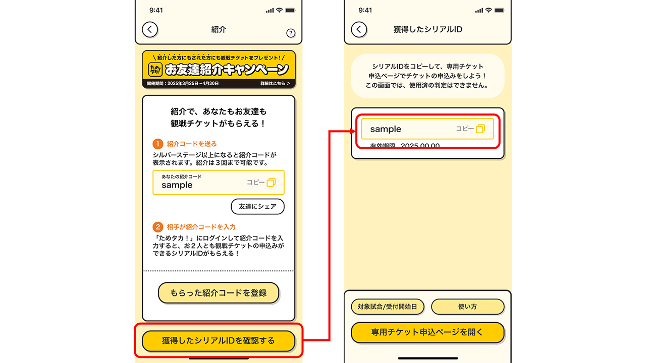 まだ「ためタカ!」アプリを利用したことがないお友達にアプリを紹介すると、紹介した方にもされた方にも観戦チケットをプレゼントします!