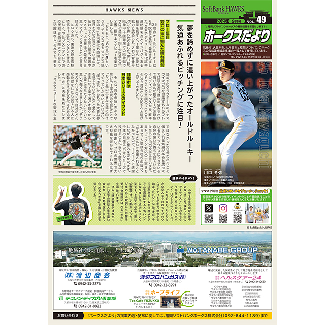 福岡市・糸島市、筑後市・久留米市・大牟田市と福岡ソフトバンクホークスの包括連携協定事業の一環として、『ホークスだより』を発行しています。 9月号の福岡市・糸島市版は川瀬晃選手、筑後市・久留米市・大牟田市版は川口冬弥投手を特集した内容でお届けします。