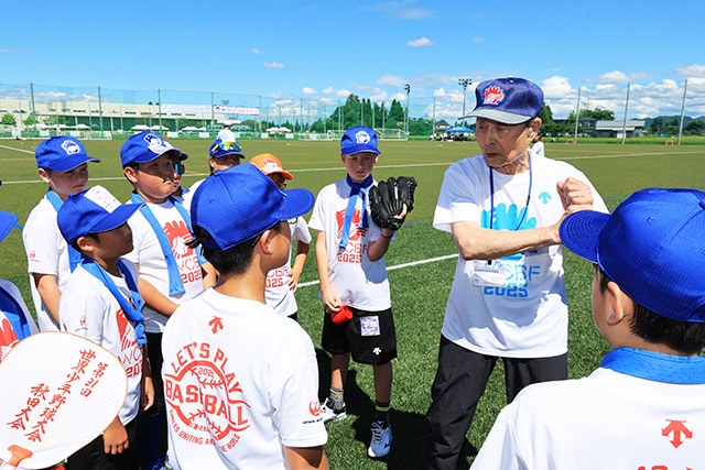 日々の野球教室は、世界11か国・地域から参加した95選手を4組に分け、投、打、守、走のセクションを時間ごとに区切って巡回していく。8月2日の指導時、王は『走』のフィールドに立っていた。