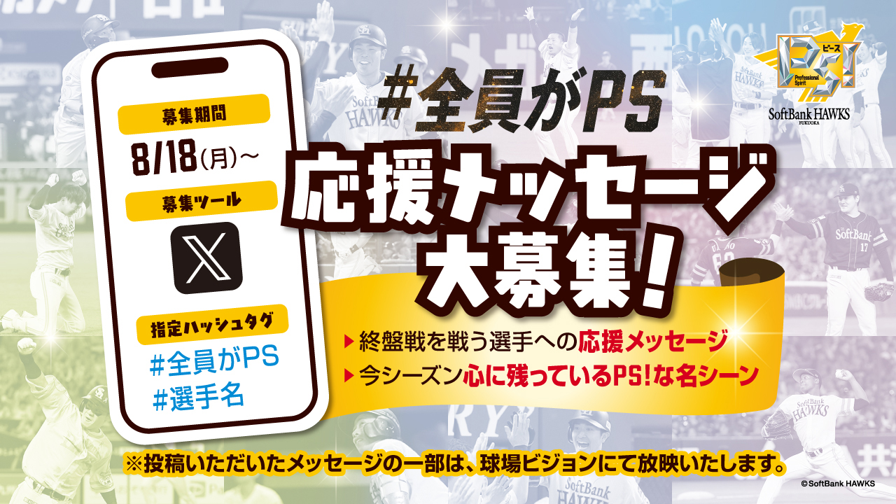 X(旧Twitter)でハッシュタグ「#全員がPS #選手名」を付けて、応援メッセージと2025シーズンであなたの心に残っている「PS!」な名シーンを募集中!投稿いただいたメッセージの一部は、コンコースビジョンやスタメン発表後の場内ビジョンで放映予定です。