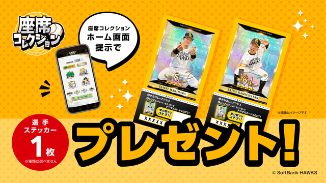 座って集めて楽しむアプリ「座席コレクション」のホーム画面をご提示いただいた方に選手ステッカーを1枚プレゼントします。