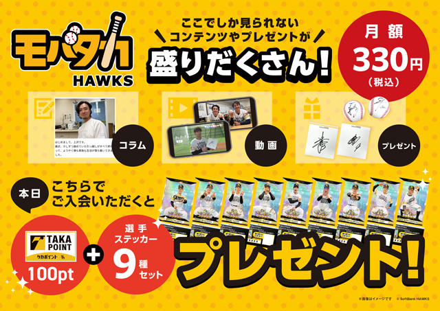 さらに、当日その場でモバイル会員コンテンツ「モバタカ」に新規入会いただいた方には、タカポイント100ptや選手ステッカーセットをプレゼント!