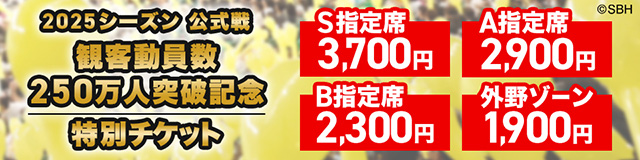 ご購入の際は必ず「観客動員数250万人突破記念 特別チケット」をお選びください。通常のS指定席、A指定席、B指定席、ホークス応援指定席、外野指定席をご購入いただいても、割引価格ではご購入いただけません。※お支払方法はクレジットカード・PayPay限定となります。