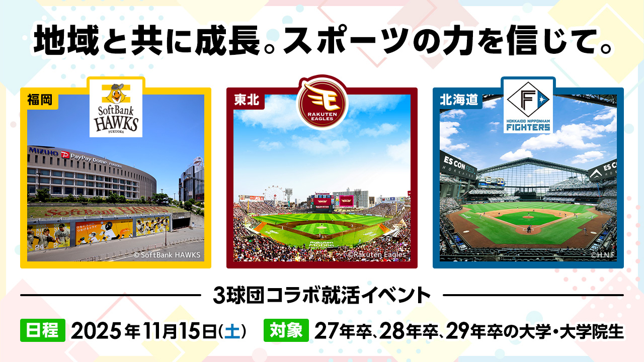 プロ野球3球団コラボ就活イベントを今年も開催!株式会社ファイターズ スポーツ&エンターテイメント、株式会社楽天野球団、福岡ソフトバンクホークス株式会社の3社が参加し、当日はプロスポーツビジネスの解説や、現場社員が登壇するパネルディスカッションなど、多彩なコンテンツをご用意しております。1度で3球団の話を聞けるこの機会にぜひご参加ください!