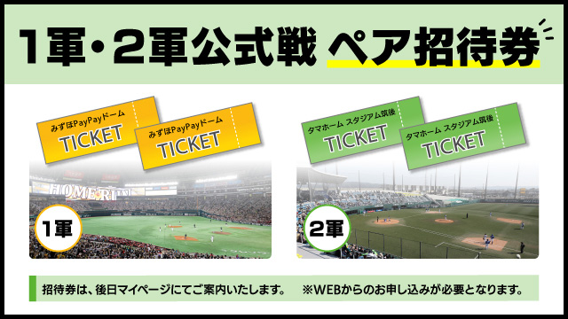 以下の対象条件を満たした方限定で、2026年ホークス主催のみずほPayPayドーム開催「1軍公式戦ペア招待」&タマスタ筑後開催「2軍公式戦ペア招待」がセットに!