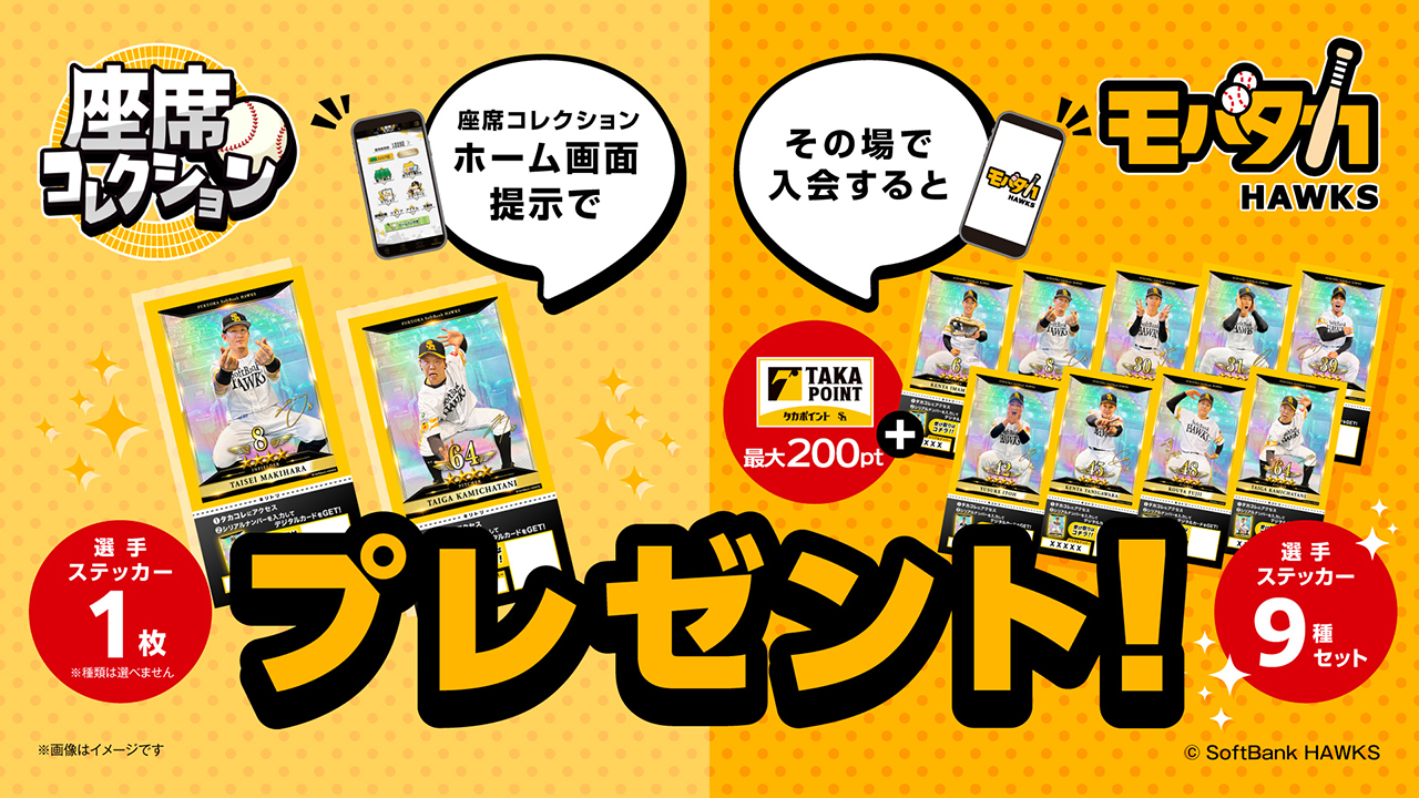 さらに、当日その場でモバイル会員コンテンツ「モバタカ」に新規入会いただいた方には、選手ステッカーセットや、タカポイント最大200ポイント(2026年度クラブホークスへ継続・新規入会済みの方が対象。そのほかの方は100ポイント)をプレゼント!