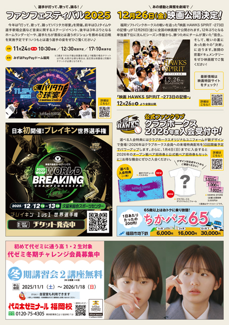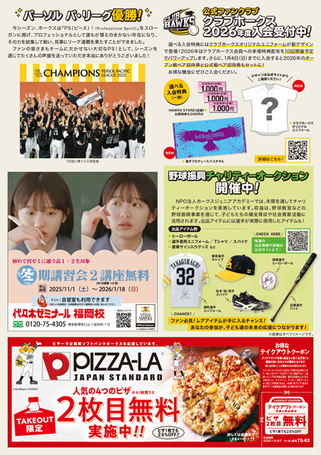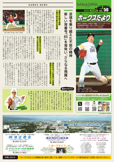 11月号の福岡市・糸島市版はリーグ2連覇達成記事、筑後市・久留米市・大牟田市版は宮﨑颯投手を特集した内容でお届けします。