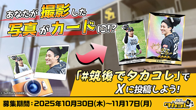 「ホークス筑後秋季練習2025」でファンの皆さまが撮影したホークス選手の素敵な写真を「#筑後でタカコレ」のハッシュタグをつけて、Xに投稿してください!採用されると投稿した写真が『ホークスカードコレクションサービス・タカコレ』にて選手デジタルカードに!写真は10月30日(木)~11月17日(月)までに投稿されている中から、選定させていただきます。ぜひ筑後へ足を運んでいただき、選手へのご声援とともに練習の様子を撮影してご投稿をお待ちしております。